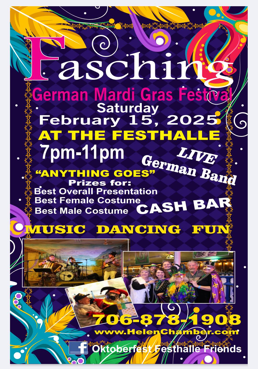 On Saturday, February 15, 2025, from 7 p.m. to 11 p.m., Helen Festhalle will come alive with music, laughter, and celebration during the annual Fasching celebration. Hosted by the Helen Chamber of Commerce, this lively German Mardi Gras party offers a unique and festive experience in the heart of Georgia’s charming alpine village.