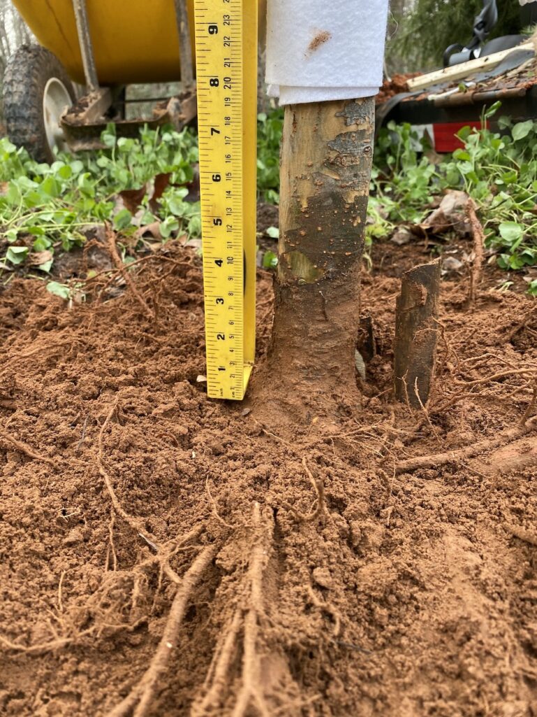 Being a good county agent, I did my homework to find the best quality stock, but even then, I followed up at home to ensure proper planting. The nursery advised me to plant the tree, cage and all, including the burlap. I decided to do some detective work when I got home and found that the uppermost lateral roots were a good 3-4” below the burlap. Had I planted these trees, they would’ve struggled to survive, and most likely died in 5-7 years when their energy reserves were exhausted.
