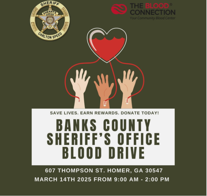 On Friday, March 14th, 2025, the Banks County Sheriff’s Office is partnering with the Blood Connection, the community blood center to host a life-saving blood drive. From 9 a.m. to 2 p.m. you can come and donate at the Banks County Recreational Department at 607 Thompson Street, Homer, Georgia.