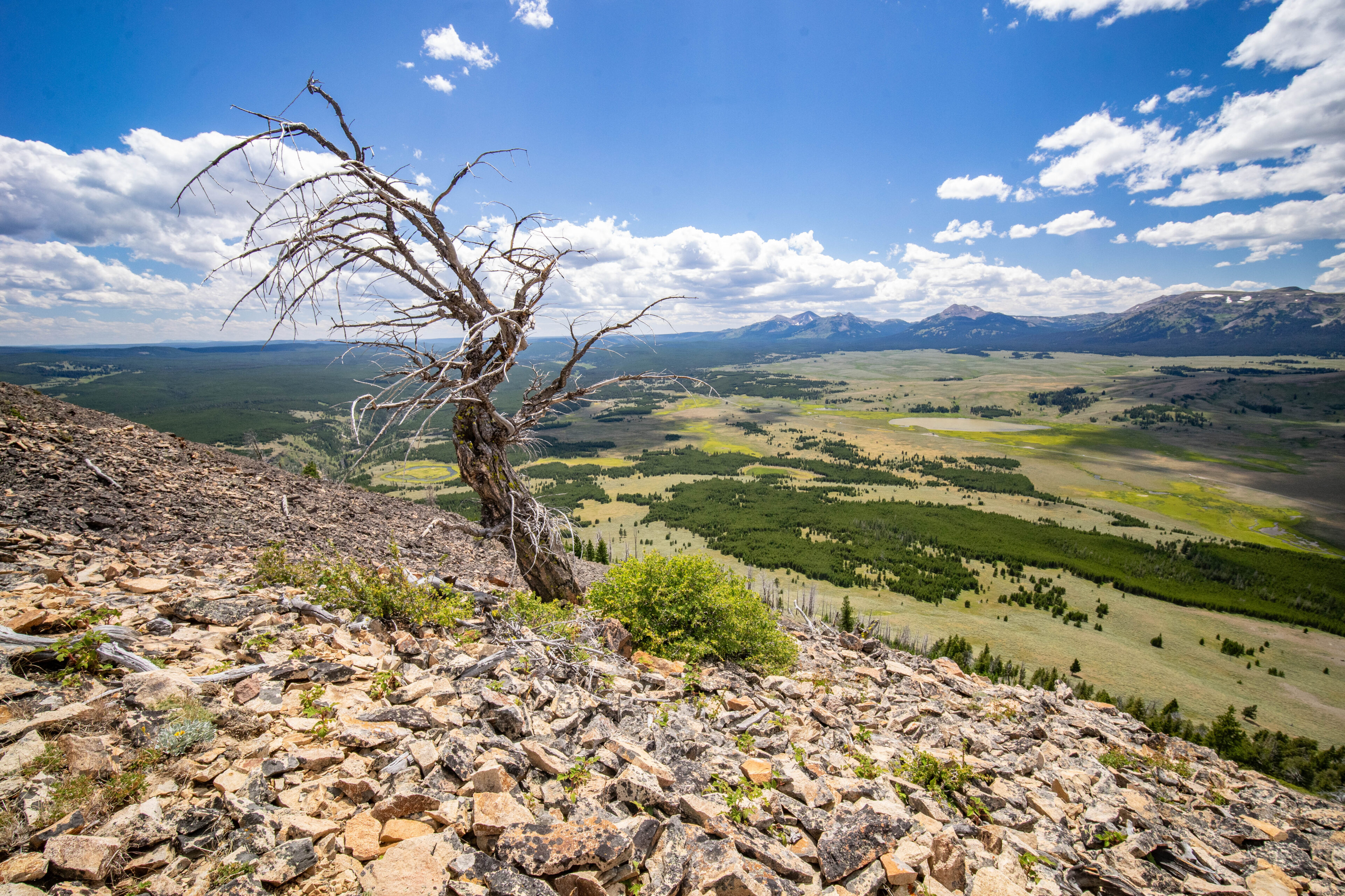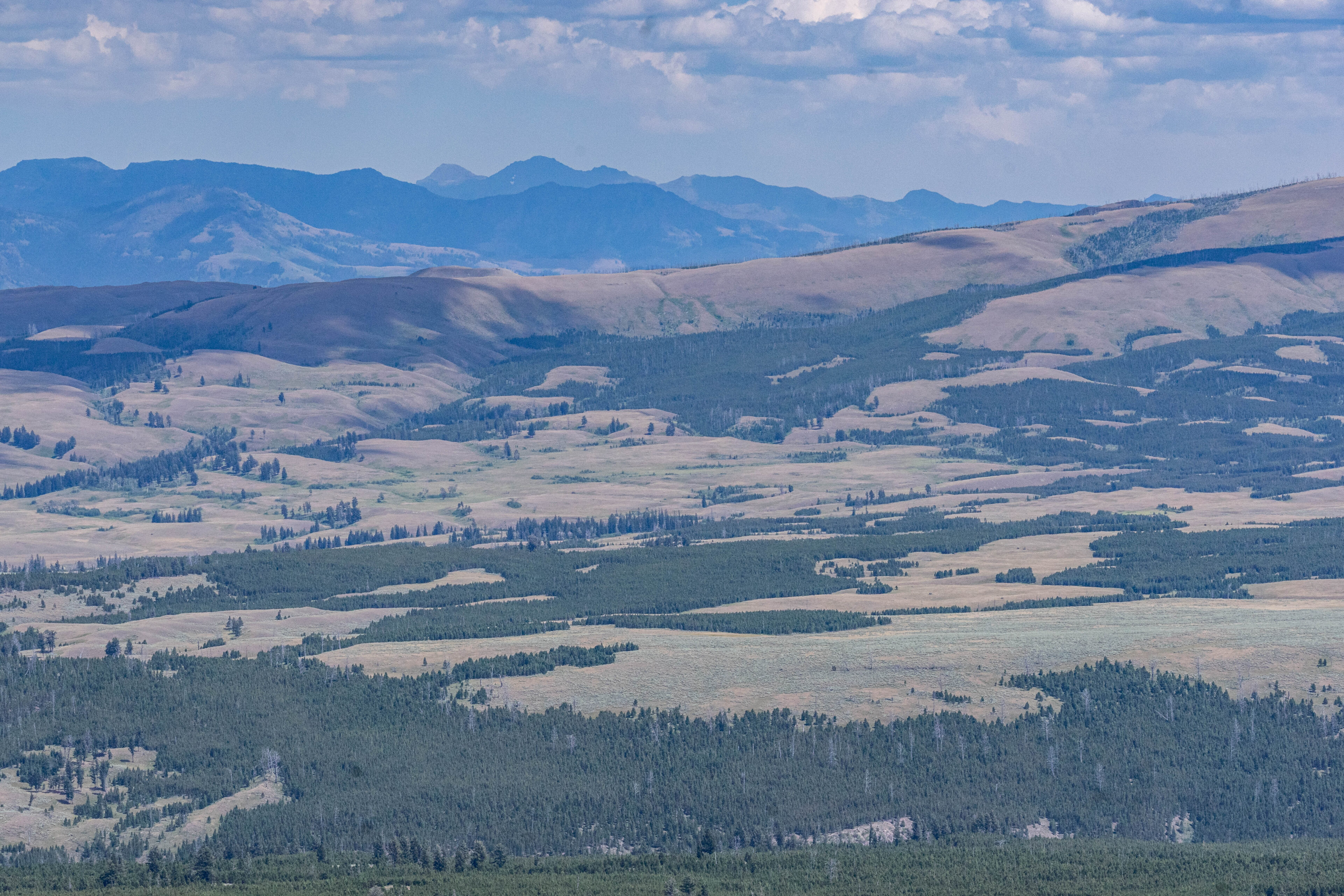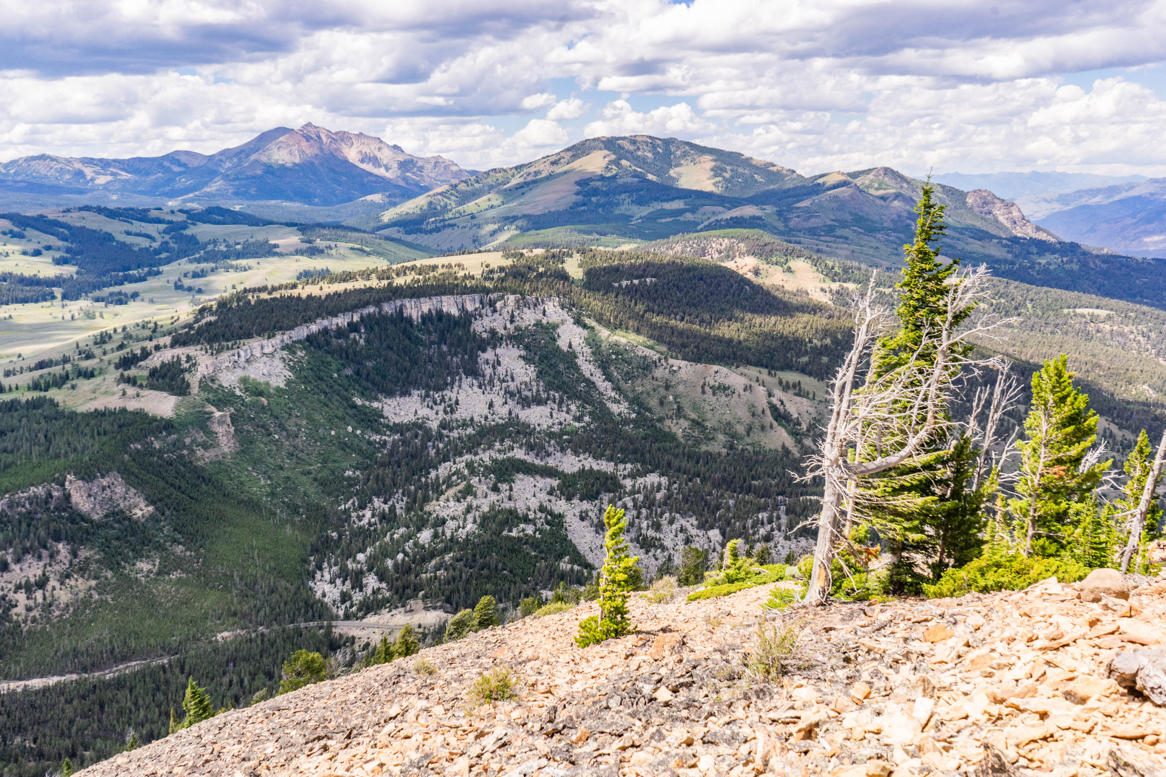 If you turn around and walk through the trees, there is one quite good view looking off to the north/northeast. It was somewhat hazy on this particular day, but you could still see all the way to the Absarorka-Beartooth Wilderness and the Beartooth Plateau, a place we would visit in just a few days time.