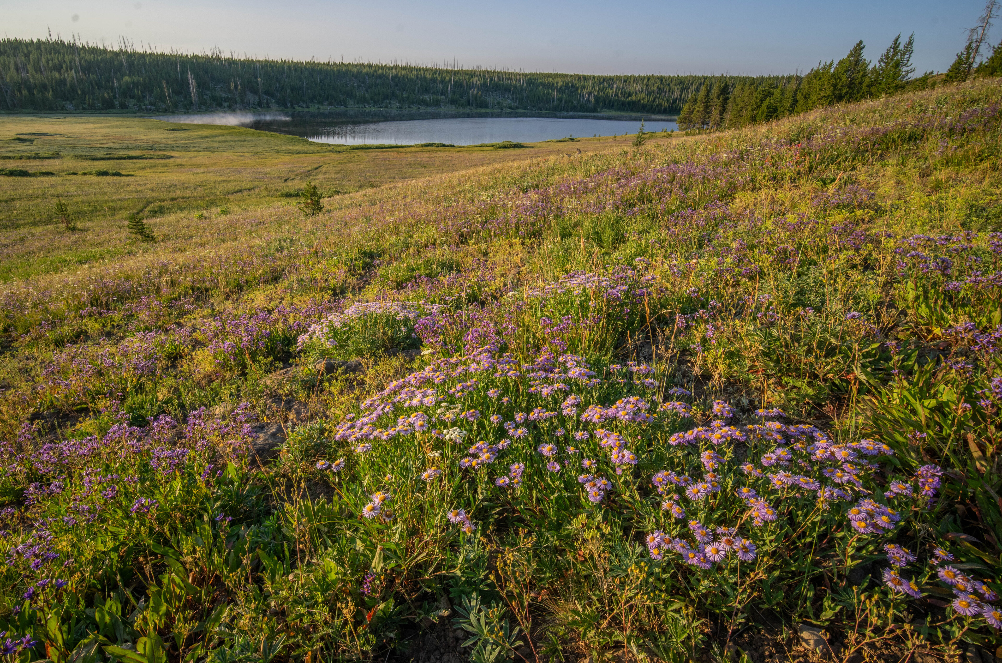 It was a bluebird morning with low humidity, which made the chilly 38º in late July feel extra fantastic. It also made the sun extremely bright, so my window for catching it without washing out the shot was very short. Just as it peeked over the nearby ridgeline, the field of purple and white flowers lit up beautifully.