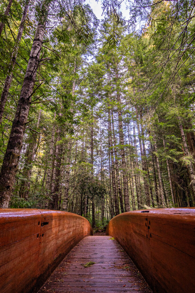 I started my morning in classic Pacific West Coast fashion: wet. March in the PNW brings plentiful rainfall and wind and I saw plenty of both. My first hike was at the Ladybird Johnson Grove trailhead. When arriving at the parking lot you are immediately greeted by a giant Coast Redwood. The bridge to cross back over the road is a thing of beauty as well. The sides are one solid piece of wood carved out of one of these giant trees.