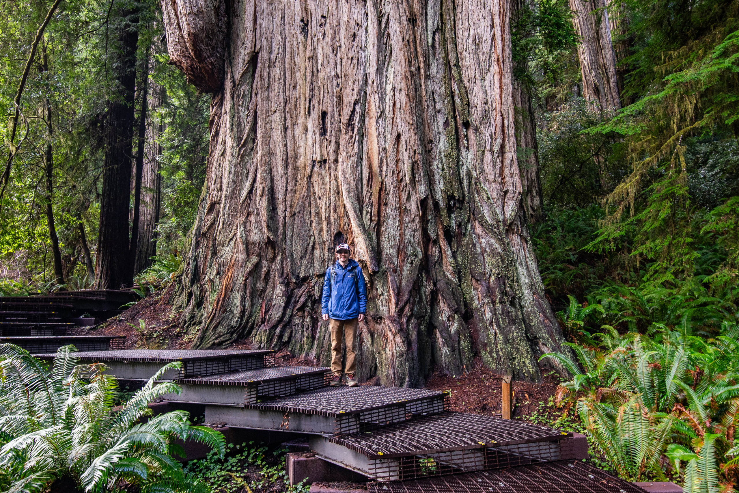 Fortunately, I had a timer on the camera and myself for scale against the biggest tree I saw on my trip on the Grove of Titans Trail.