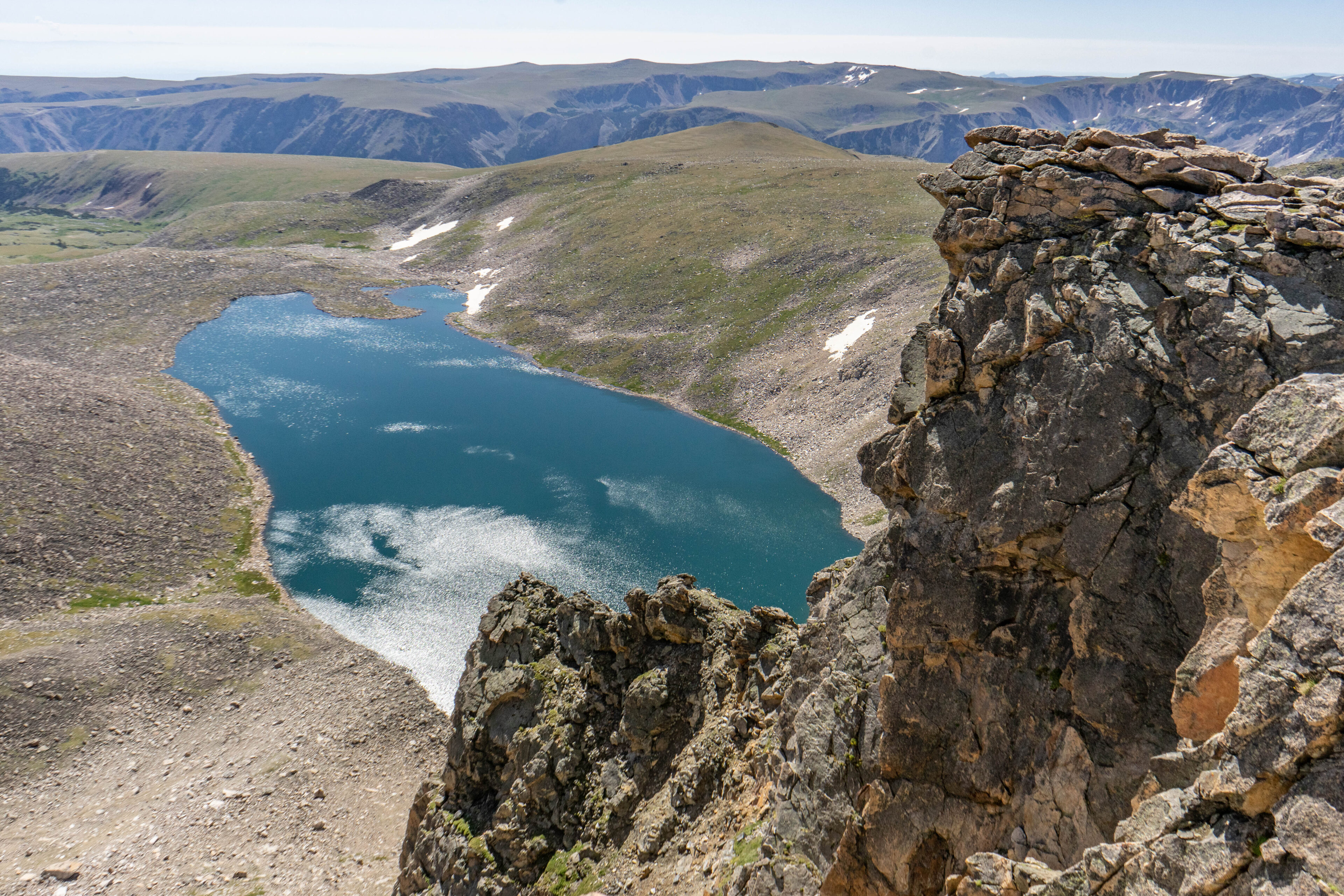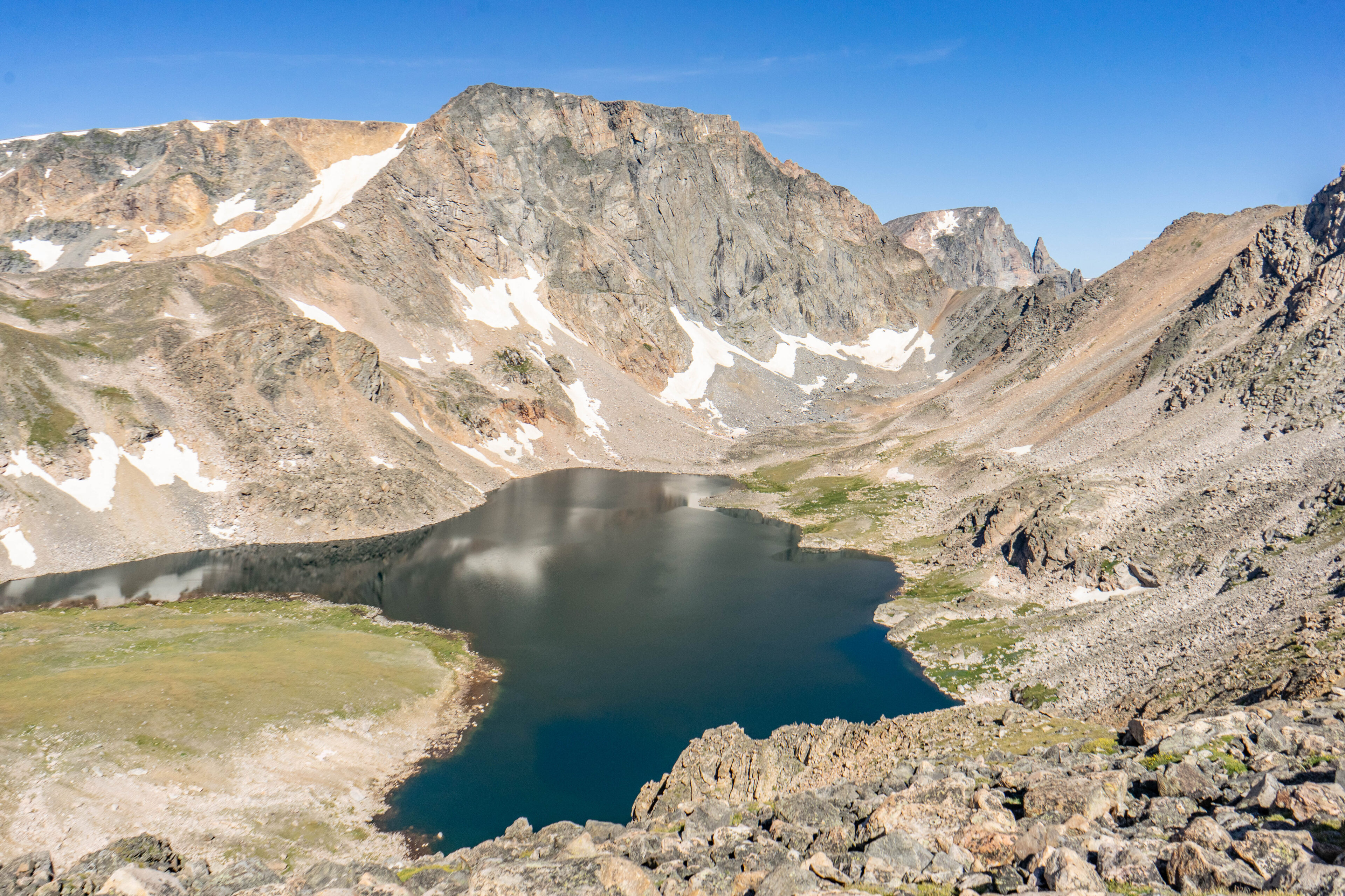 You may notice the ridiculous number of rocks in our way. This landscape was carved out exclusively by glaciers and as they melted they left behind a seemingly infinite number of boulders. Our path zig zagged between these boulders ranging from the size of your fist to the size of a VW bug as we approached the final summit bid. From here, you have about 1,000 vertical feet to climb in right around 1 mile or a bit less depending how you choose to go. We were lazy, stupid, or a mix of both and after studying our topographic maps decided it would be just as easy to go straight up. The beautiful Moon Lake that we had failed to reach the day prior lay out beneath us reflecting the snow and small glaciers below.