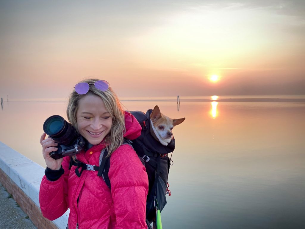 “Manny is my dog and goes everywhere with me. He’s 15 years old and has arthritis so I carry him around in a backpack. When Joe can’t travel with me, Manny is happy to play ‘man of the house.’ He wasn’t thrilled during the Mt. Etna eruptions and hid in the bathroom the whole time.”
