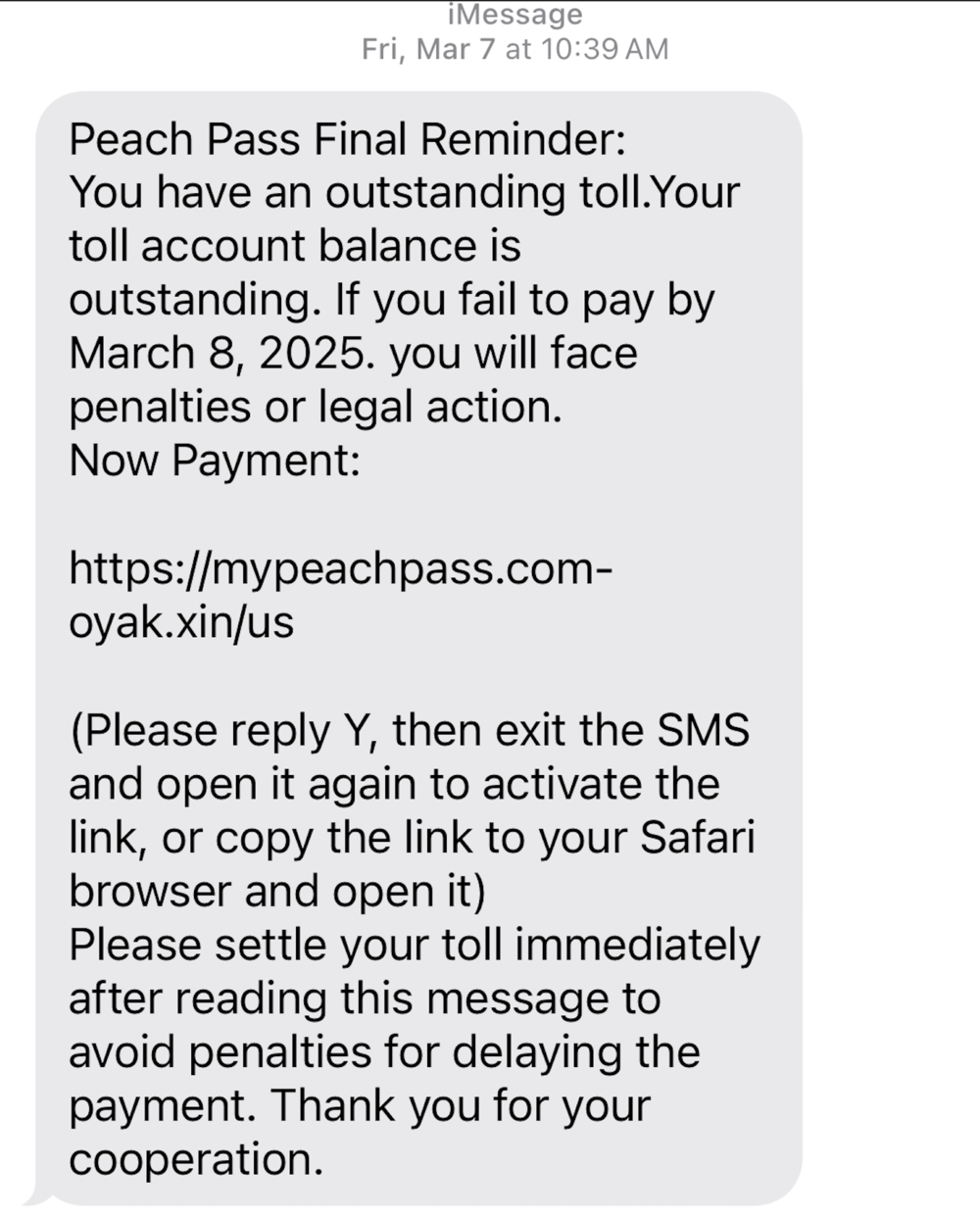 Peach Pass, the electronic toll system managed by the State Road and Tollway Authority, has issued many statements telling people that they will never send text messages about toll violations — and urging people not to click on any links in such messages.