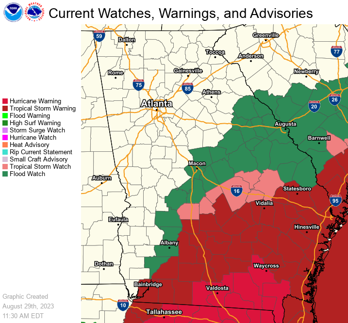 The South Georgia counties of Brooks, Lowndes, Lanier, Echols, Clinch, Ware, and Charlton are under a Hurricane Warning.