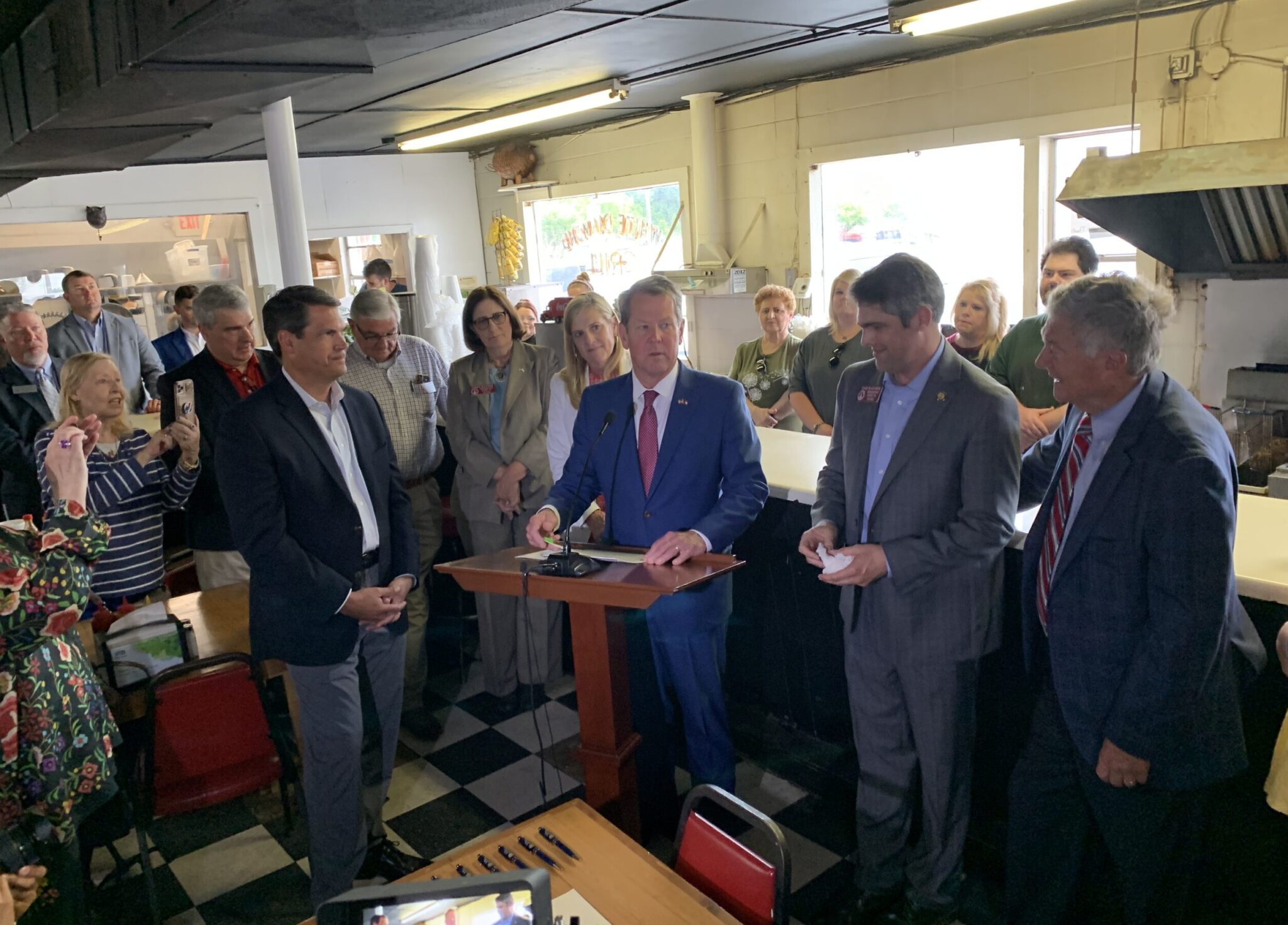 The governor traveled to his GOP challenger David Perdue’s hometown Tuesday and sat at a table inside the cramped quarters of Perdue’s favorite restaurant, the White Diamond Grill in Bonaire, to sign into law a tax cut plan as lawmakers and local officials squeezed into the small-town diner.