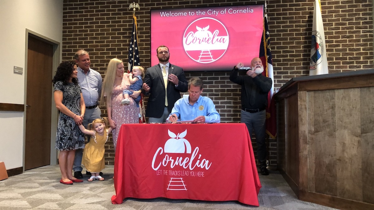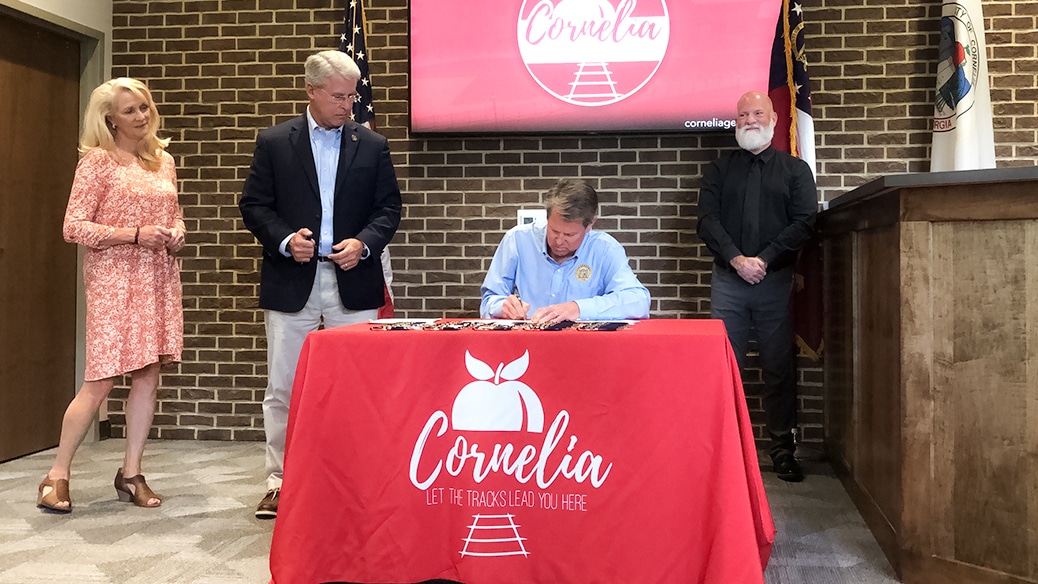 Members of the Georgia Legislature, local government officials, and area residents gathered at Cornelia City Hall Thursday to watch Governor Brian Kemp sign ten bills into law.