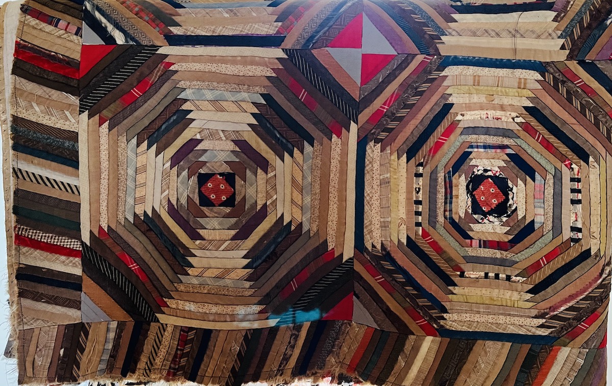 At the bottom of her cedar hope chest was an old, pieced quilt that was not quite finished–it still needed quilting. The top was hand-stitched with tiny pieces of folded men’s clothing material. Old ties, shirts, and suits were cut into strips no wider than a half-inch, forming an utterly stunning log cabin design.