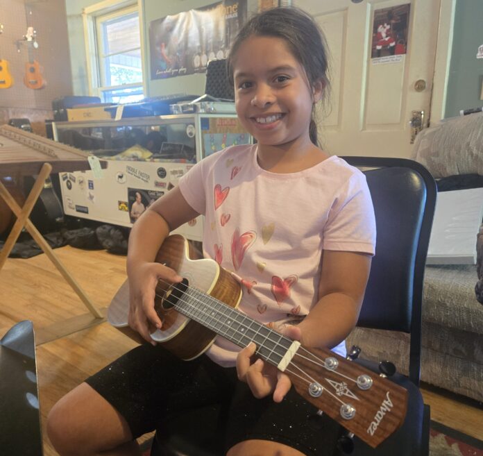 Homeschooled music student, Elli, is beginning her music education journey by using a ‘right-sized’ acoustic instrument made available at Blue Ridge Music in Clayton from a grant from The Georgia Music Foundation. The grant was awarded to the Southern Highland Music Foundation, a nonprofit organization dedicated to teaching and preserving the music of Georgia’s Southern Appalachian region. (Photo submitted)