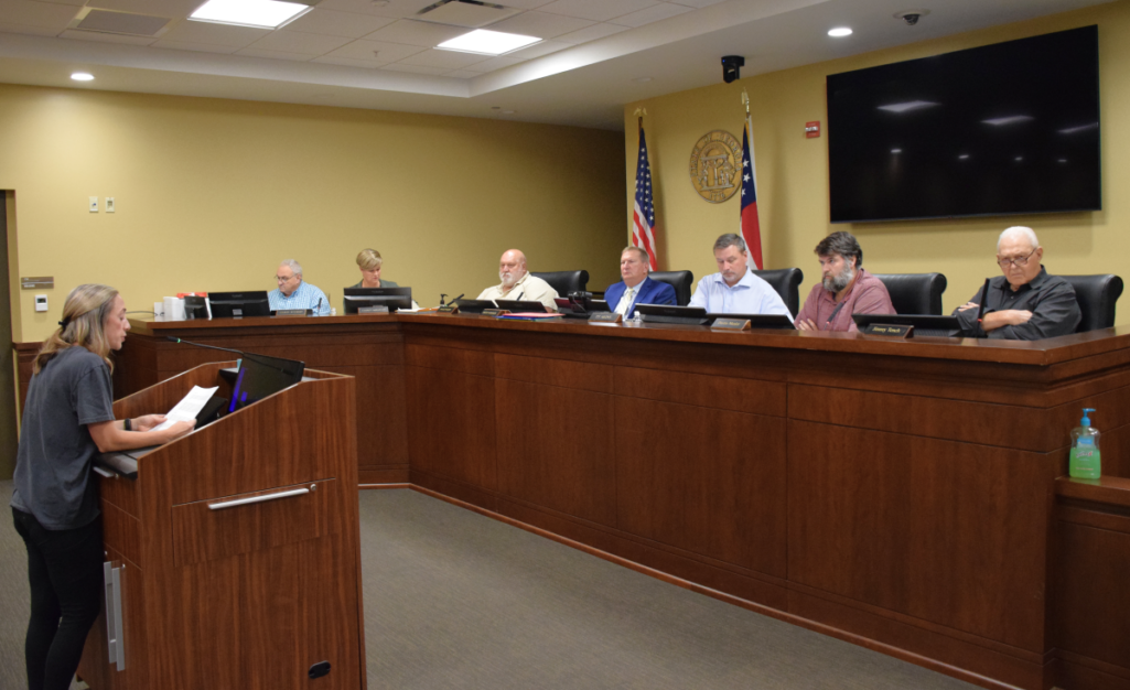 Heather Benton addresses the Habersham County Commissioners during public comments to save the gymnastics program. (Jerry Neace/NowHabersham.com)
