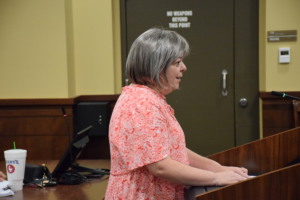 Michele Shirley tells the Commissioners how the gymnastics program taught her daughter life lessons. (Jerry Neace/NowHabersham.com)