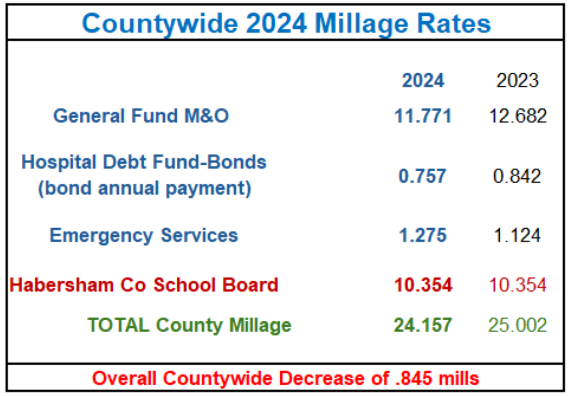 The millage rate applied to the hospital debt fund (hospital bonds) will also see a slight decrease. The millage rate for Emergency Services came in a bit higher. The overall millage rate reduction for the county’s 2024 taxes will be .845 mills overall. This does not include the school board millage rate. However, that millage rate remained unchanged for 2024.