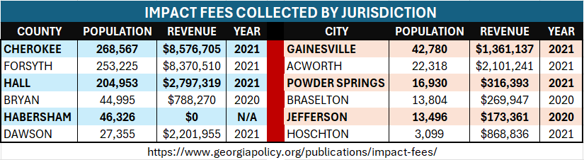 Hall County collected $2,797,319 in impact fees in 2021. In the same year, Dawson County collected $2,201,955. More information about impact fees in other jurisdictions can be accessed here.