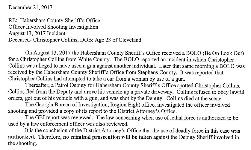 In a statement released today, Christian says his office reviewed the shooting investigation results from the Georgia Bureau of Investigation as well as the law regarding use of lethal force. Based on those reviews, his office determined “deadly force in this case was authorized.”
