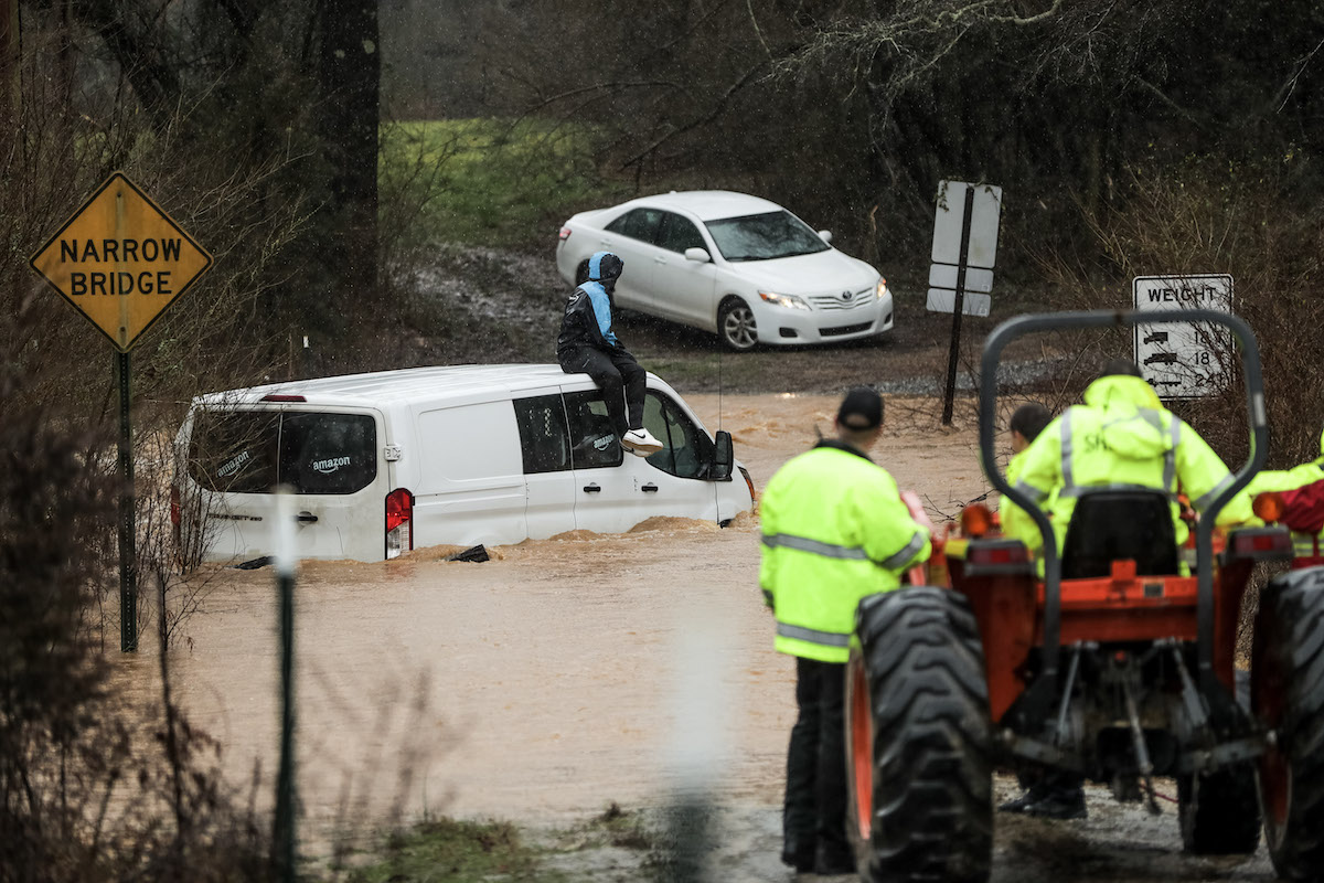 One of the trapped drivers was an Amazon deliveryman. His van was overtaken by floodwaters as he attempted to cross a bridge over Little Mud Creek on Garrison Drive in Cornelia.