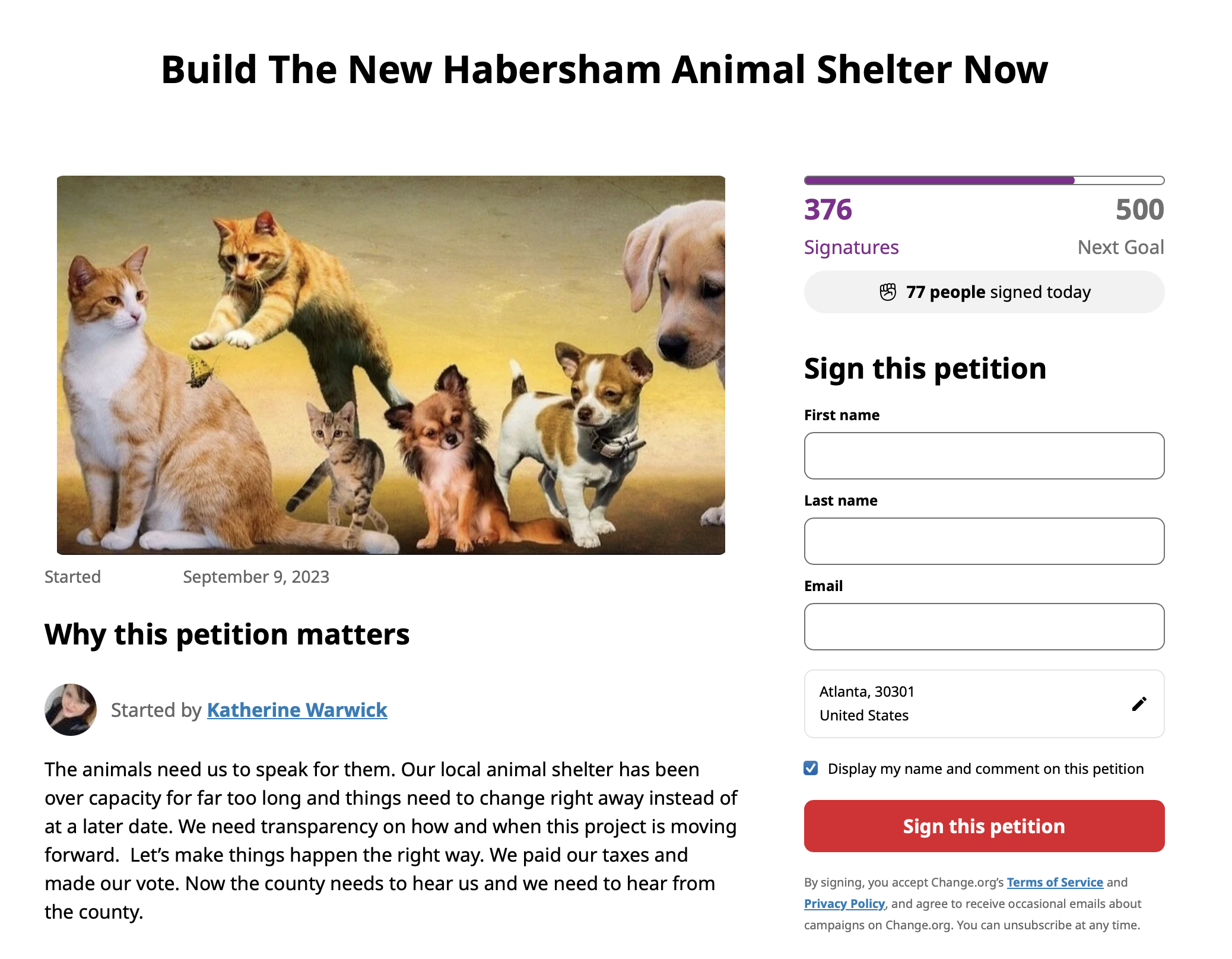 On September 9, an online petition began circulating on change.org asking people to sign in a push to get the new animal shelter built.