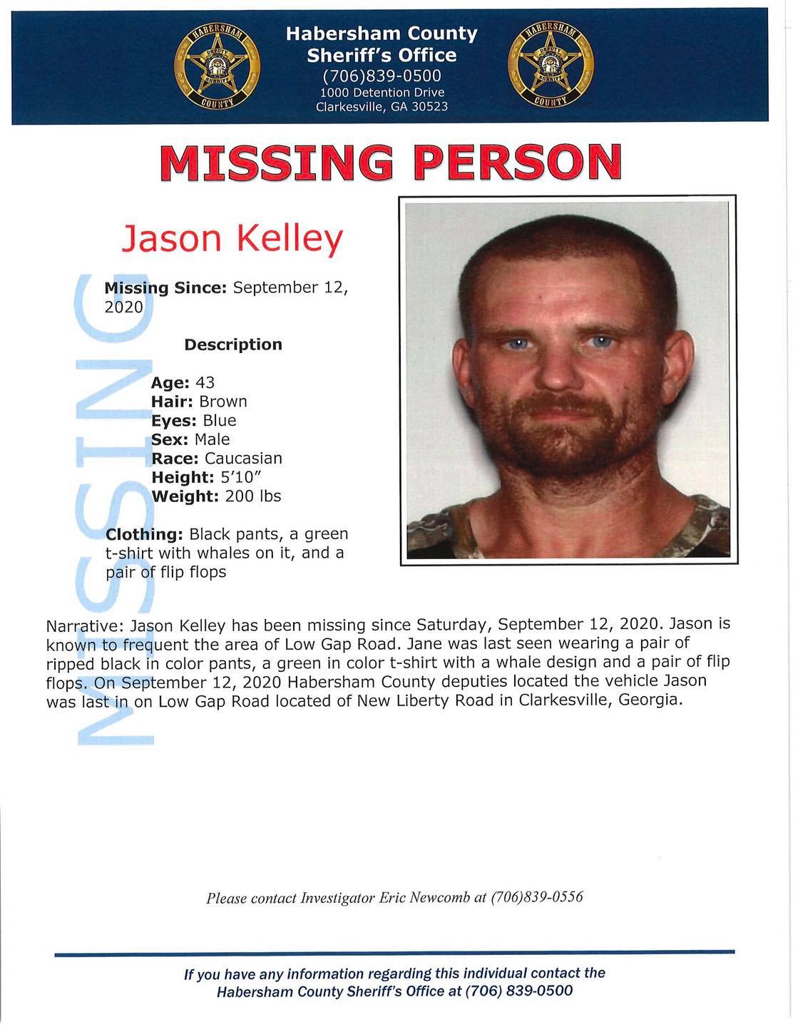 Friends say 43-year-old Jason Kelley was last seen at 6 p.m. on September 12 at his home on Alec Mountain Road. Deputies later found his abandoned vehicle on Low Gap Road near New Liberty Road in Clarkesville.