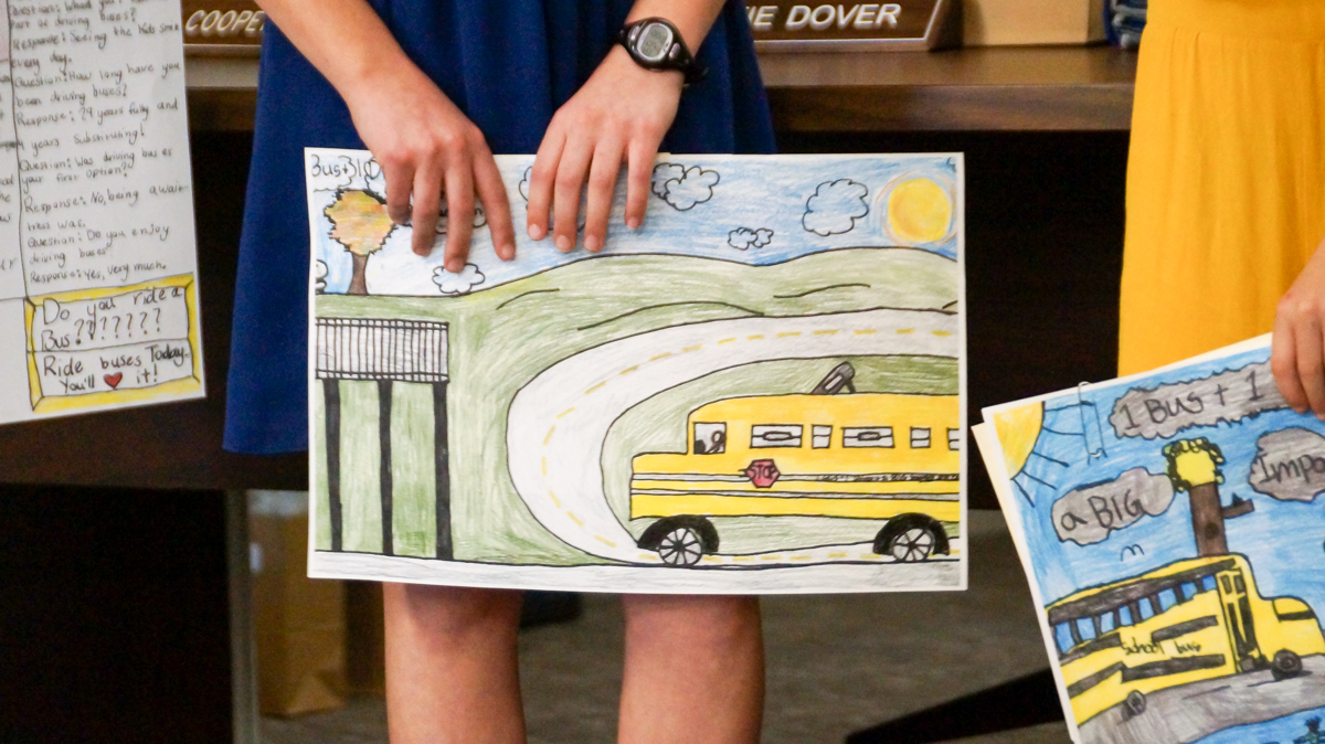 The pieces were entries into the National Association of Pupil Transportation’s annual school bus safety poster contest. Students compete at the school, state and national level for the grand prize: the best poster in each division becomes the promotional poster for the NAPT.