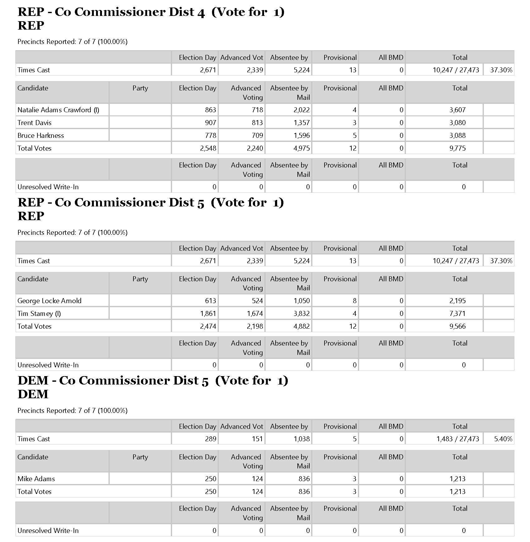 Habersham County’s official and complete results (see below) must now be certified by the Georgia Secretary of State’s Office. Once that happens, there will be a recount in the District 4 Commission race to determine who will run against incumbent Natalie Crawford in the August 11 runoff. Only eight votes separate the challengers. Trent Davis trailed Bruce Harkness in the initial polling.