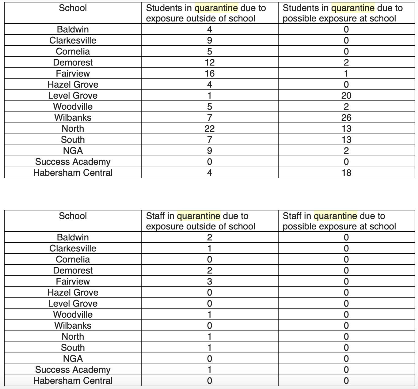 Last week, there were 105 Habersham students in quarantine at home due to possible exposure outside of school and 97 students quarantined due to possible exposure at school. Twelve Habersham school staff members were in quarantine, but none of them were reported to have been exposed to the virus at school.