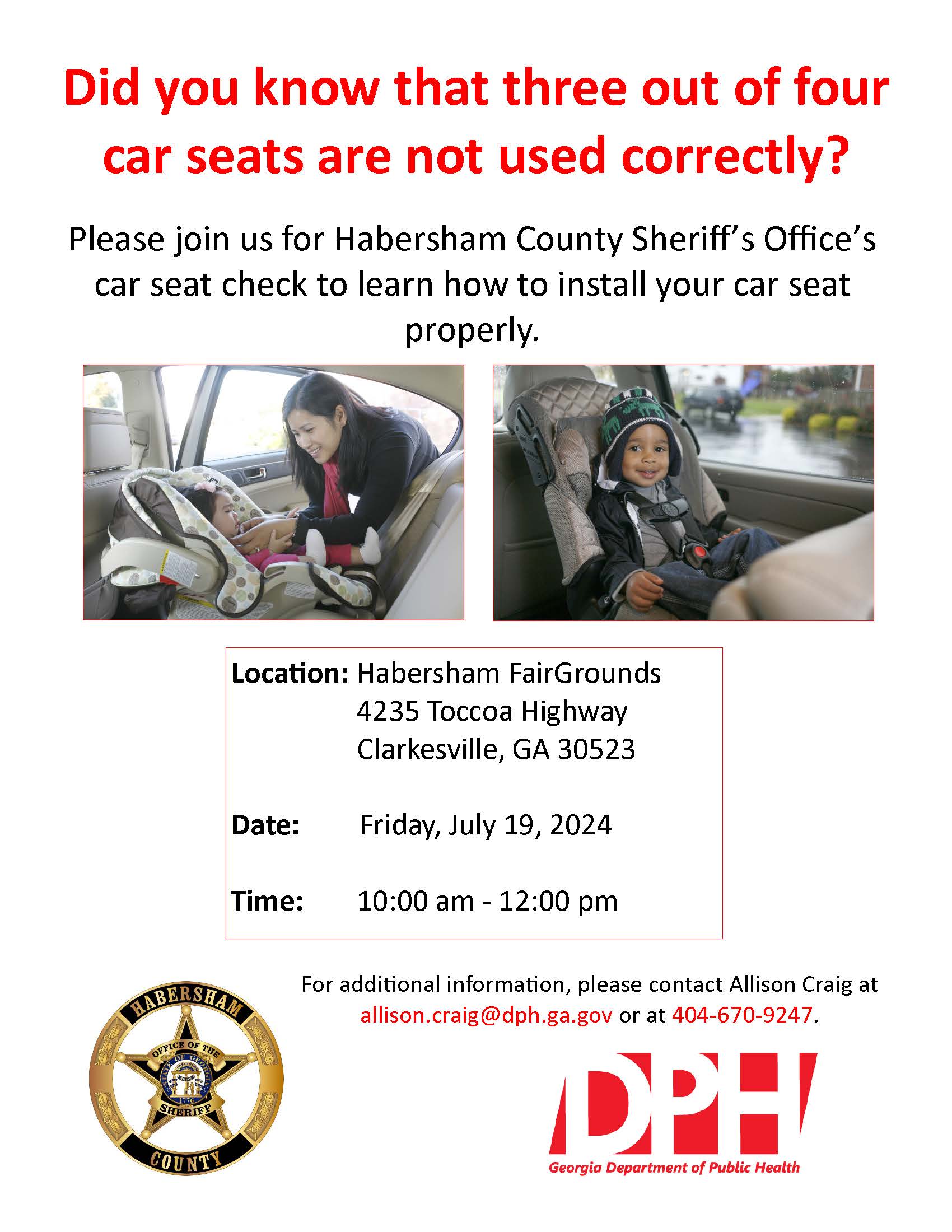 The Habersham County Sheriff’s Office will host a free car seat check from 10 a.m. to noon this Friday, July 19, at the Habersham County Fairgrounds near Clarkesville.