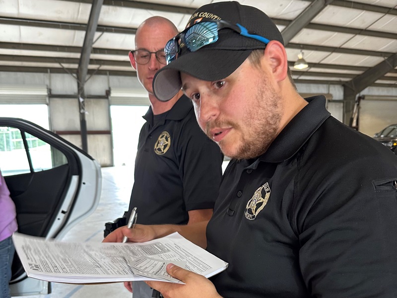 School Resource Officers Cody Gable and Austin Martin gather information for paperwork during a 2023 car seat check at the fairgrounds. (Rob Moore/Habersham County)