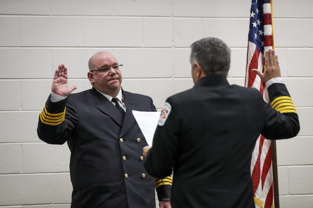 Chief Jason Davey takes the HCES oath during his badge pinning ceremony in Clarkesville on Jan. 17, 2020. (Daniel Purcell/Now Habersham)