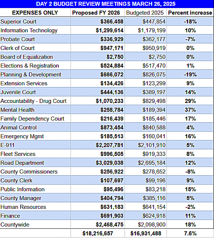 Wednesday’s presentation saw a repeat of the average increase of 7.6% over the 2025 budget. The remaining department budgets for day 2 of the Budget Review Meetings totaled $18,216,657, an increase of $1,285,171 over the prior year’s operating budgets.