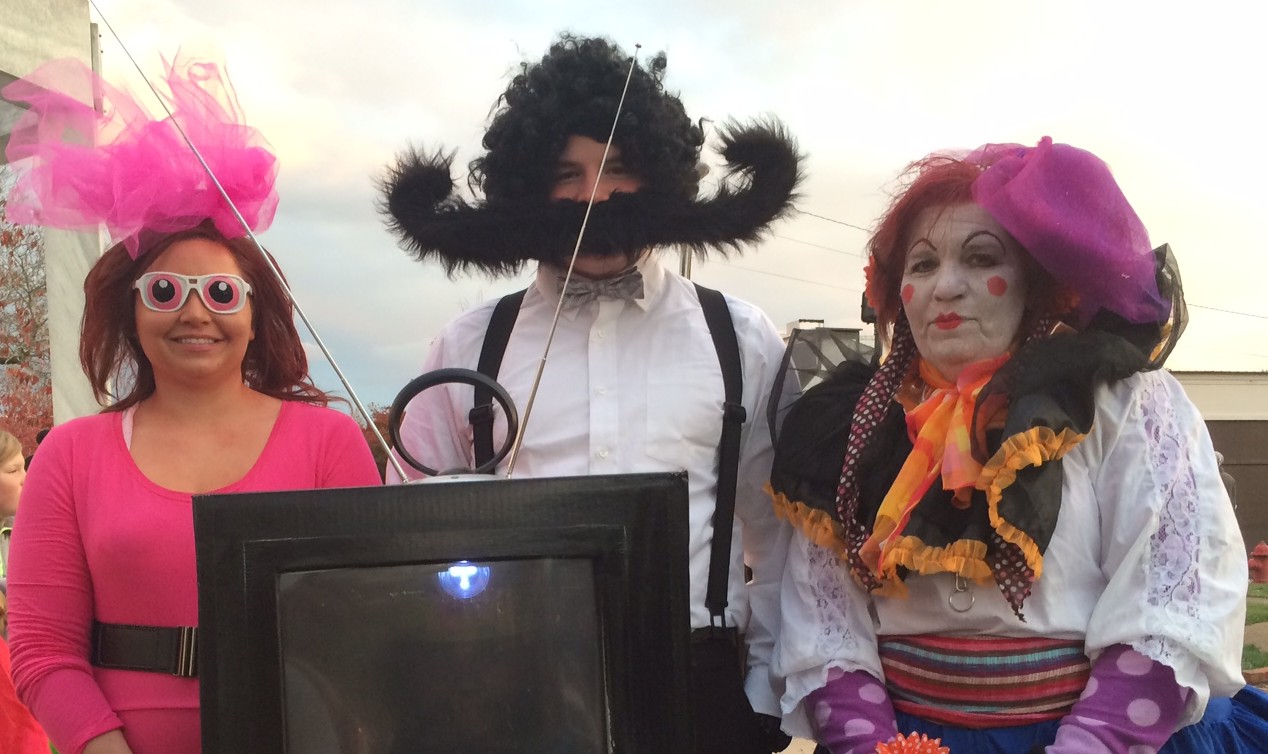 Candice Maner (Power Puff Girl, Blossom), Dustin Coleman (crazy hair dude), Laura Maner (clown) and Corbin Browitt (TV) of Clarkesville sport creative, homemade costumes.