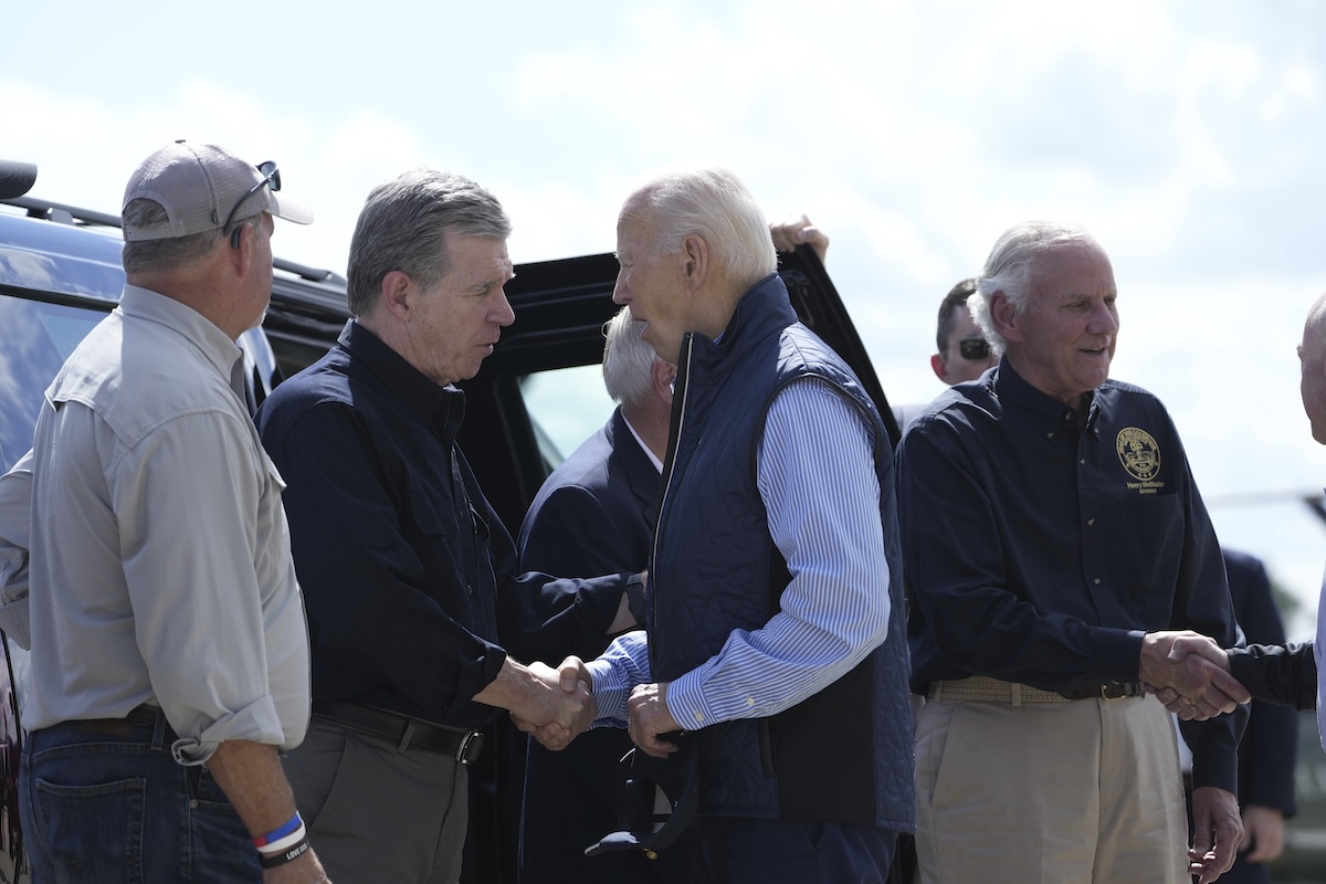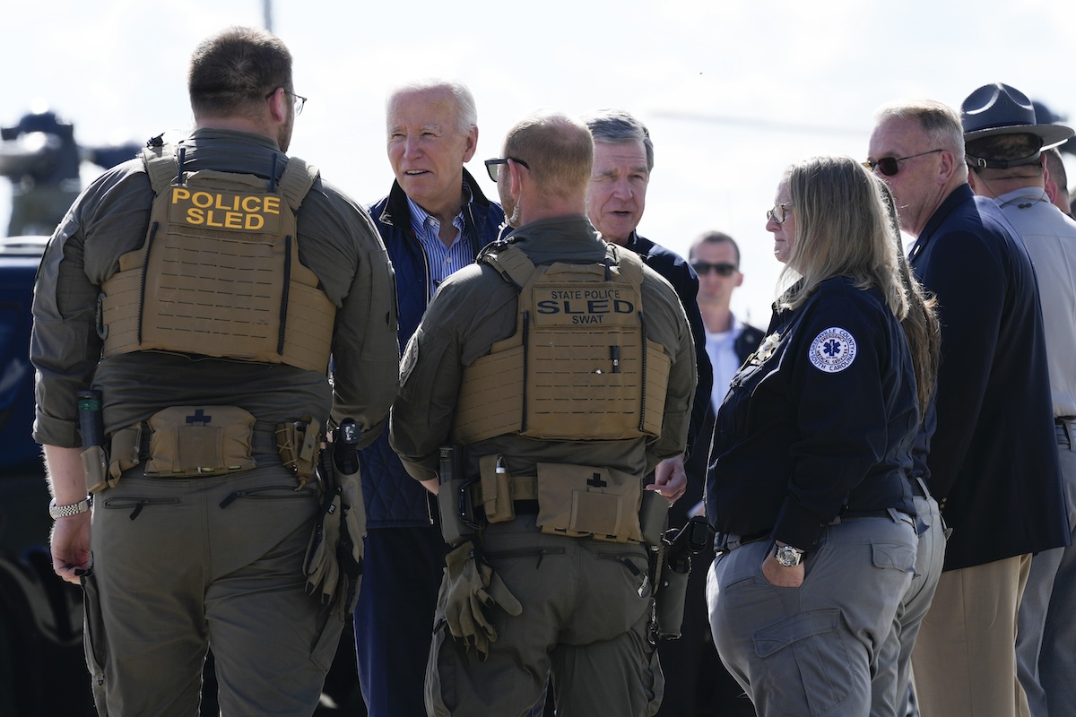 About 200 miles north in the Carolinas, Biden was also surveying the storm’s aftermath. With many of the area’s roads inaccessible, he flew by helicopter over toppled trees, twisted metal and towering piles of debris in the normally tourist-friendly downtown of Asheville.