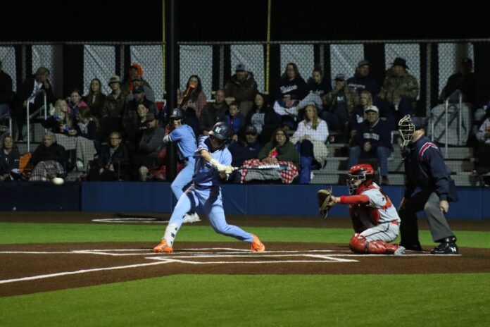 Habersham Central High School sophomore Maverick Chitwood (5) swings at a pitch against Gainesville High School Wednesday, March 6 in Mt. Airy. (Zack Myers/NowHabersham.com)