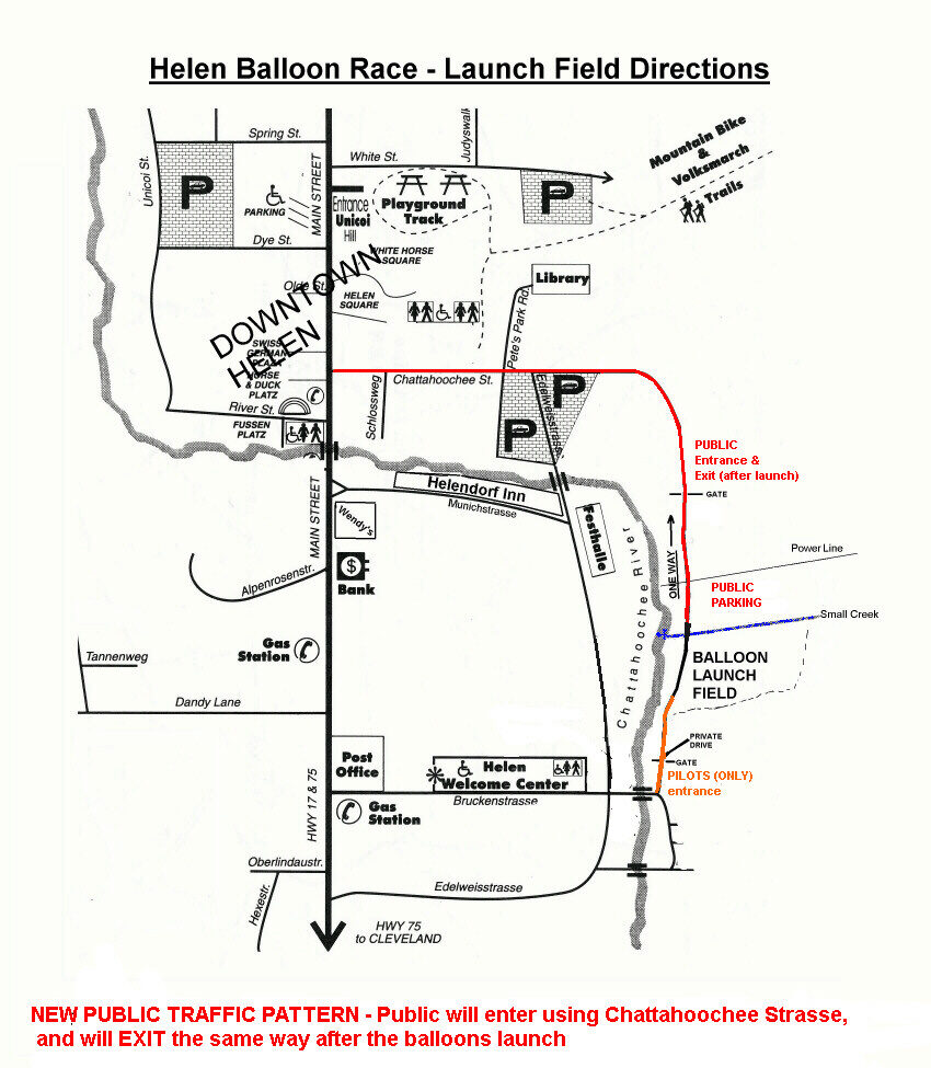 Race organizer Catherine Cleiman, who also manages the Helendorf River Inn, Suites & Conference Center, says general parking for the event has changed this year. Spectators will be required to take Chattahoochee Street to arrive at the public vehicle entrance (see map below). The entrance was reached in previous years by crossing the Brucken Strasse bridge. That entrance is now reserved for participating teams and media. Pedestrians may enter the balloon field from either entrance.