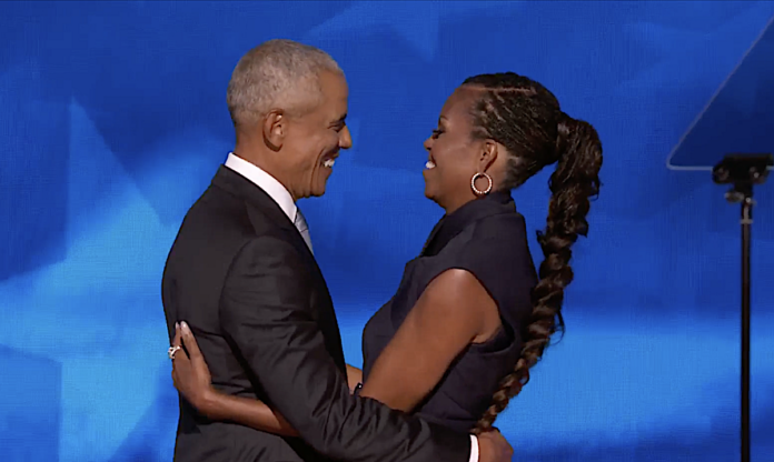 Former U.S. President Barack Obama greets former First Lady Michelle Obama as he arrives to speak on stage during the second day of the Democratic National Convention at the United Center on Aug. 20, 2024, in Chicago, Illinois. (DNC livestream image)