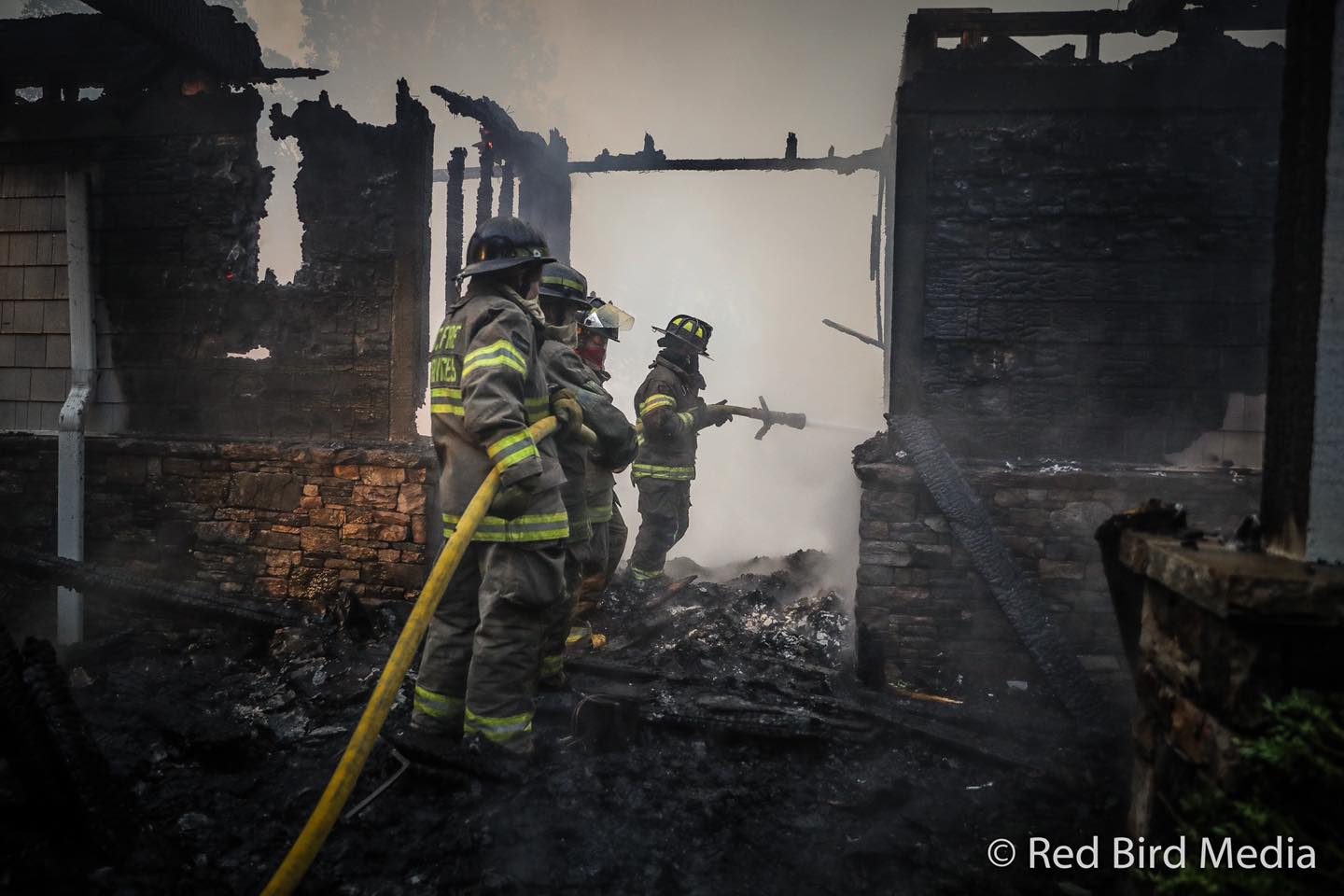 Unable to save the home, crews took a defensive attack. They shuttled in water from a nearby hydrant with tanker trucks and used a fireboat to fight the flames from the lake side.