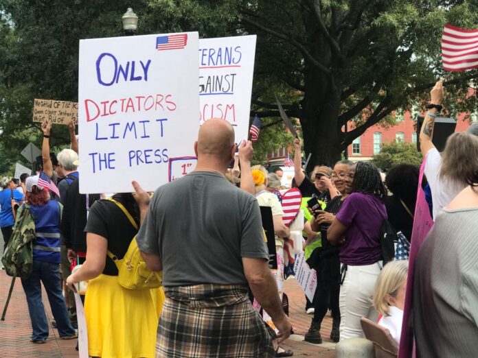 A handful of Trump supporters stood directly across the street. The opposition was a small but vocal crowd. Bruce said “I don’t like calling them opposition because they’re not. They’re our neighbors. They could be our friends and so out here today we all need to go and talk to somebody that we haven’t talked to before. Every one of us because that’s the way we’re gonna build a community.”