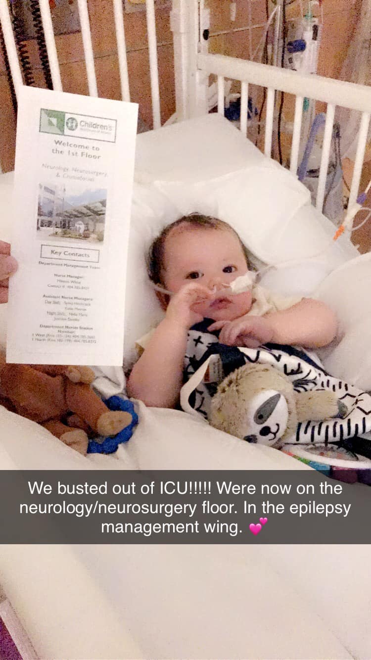 As of yesterday at 3:30 a.m., Hudson is now out of CHOA’s ICU and is no longer on oxygen. Hudson’s recovery is continuing in the Epilepsy Management Wing of the hospital, where his doctors are helping him with physical and occupational therapy.