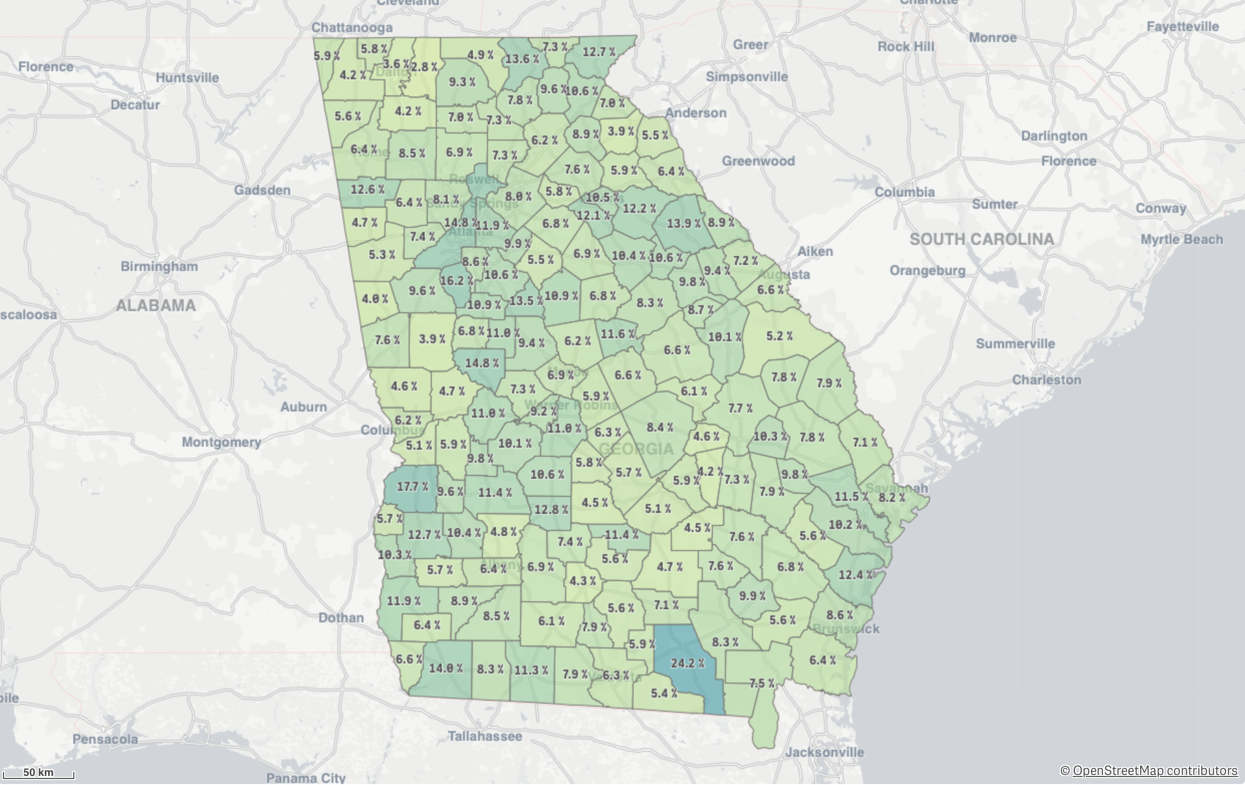 According to figures from the Georgia Secretary of State’s Office, 640,480 people have already cast ballots, with the highest single-county turnout in South Georgia’s Clinch County (highlighted in blue on the map below).