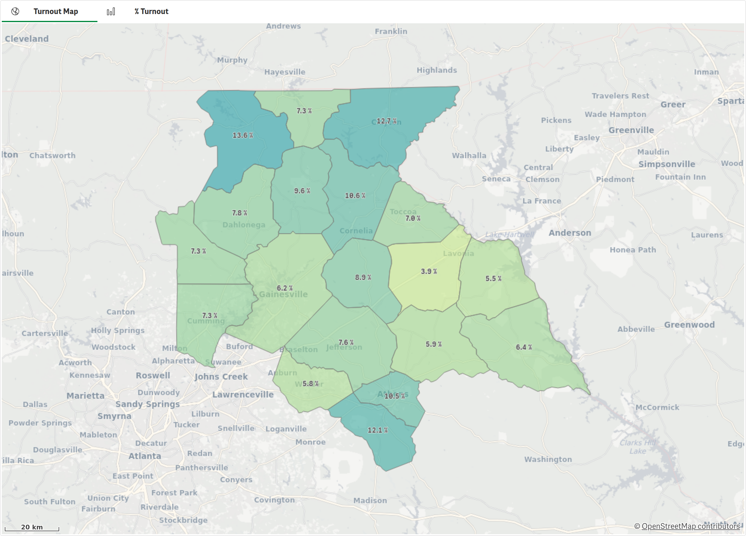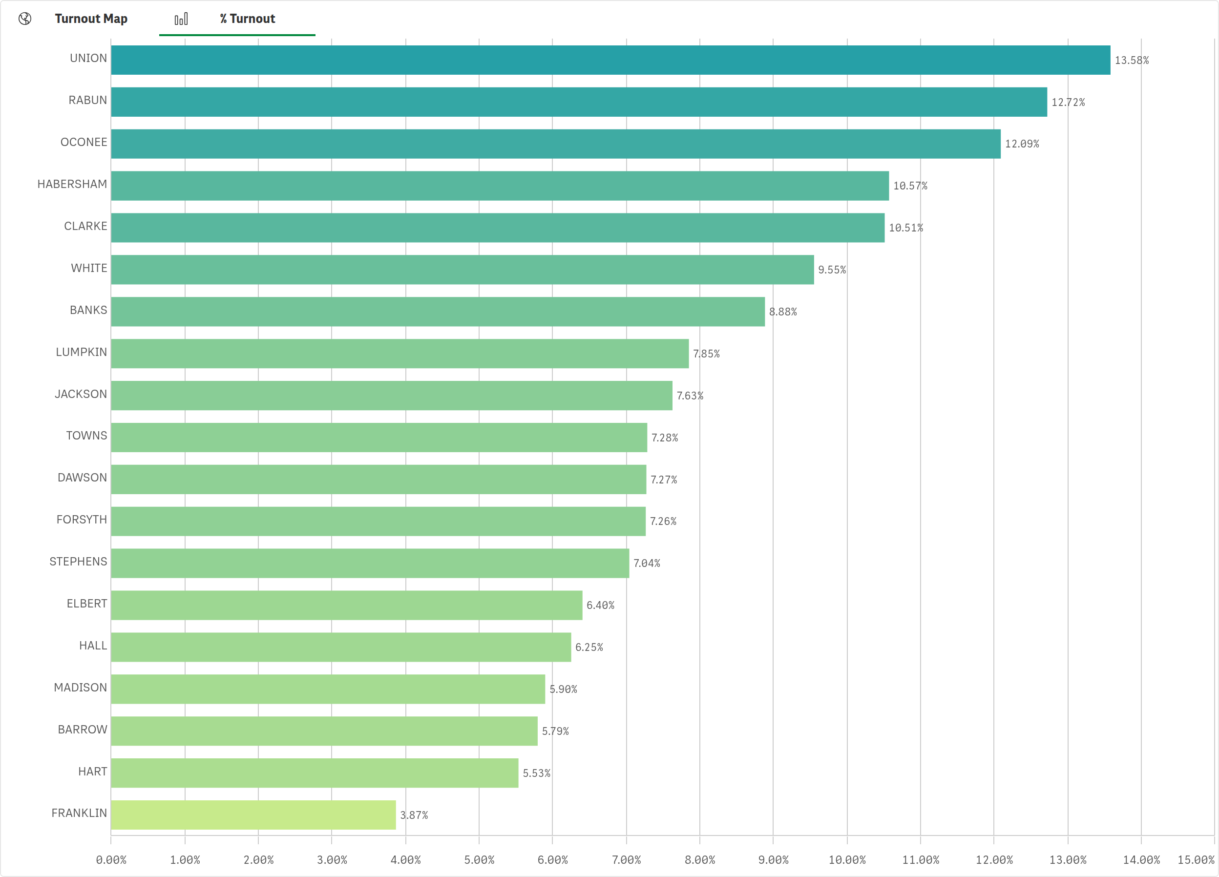 In Northeast Georgia, Union County recorded the highest early turnout with 13.5% of the county’s 21,408 active registered voters casting ballots. Rabun County was second, with 12.72%, or 1,689 voters out of 13,279.