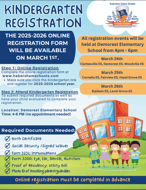 Online registration must be completed in advance. The registration form is available at the Habersham County Schools website. You can also click here to access the form. You need to click the Kindergarten link and register for 2025-2026.