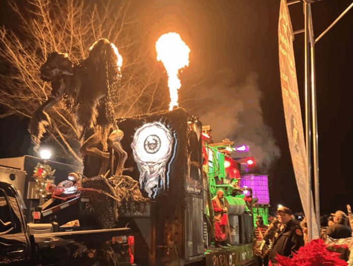 The procession shifted when a float from Paranoia Haunted House moved down the route. The float carried large demons with contorted limbs and flames that rose above the platform. Families later reported that children reacted with fear when the fire, skeleton figures, and anthropomorphic demons came into view. One grandmother wrote on Facebook, “Yeah, scared the grandchildren to death,” and other public posts described similar scenes as the float passed.