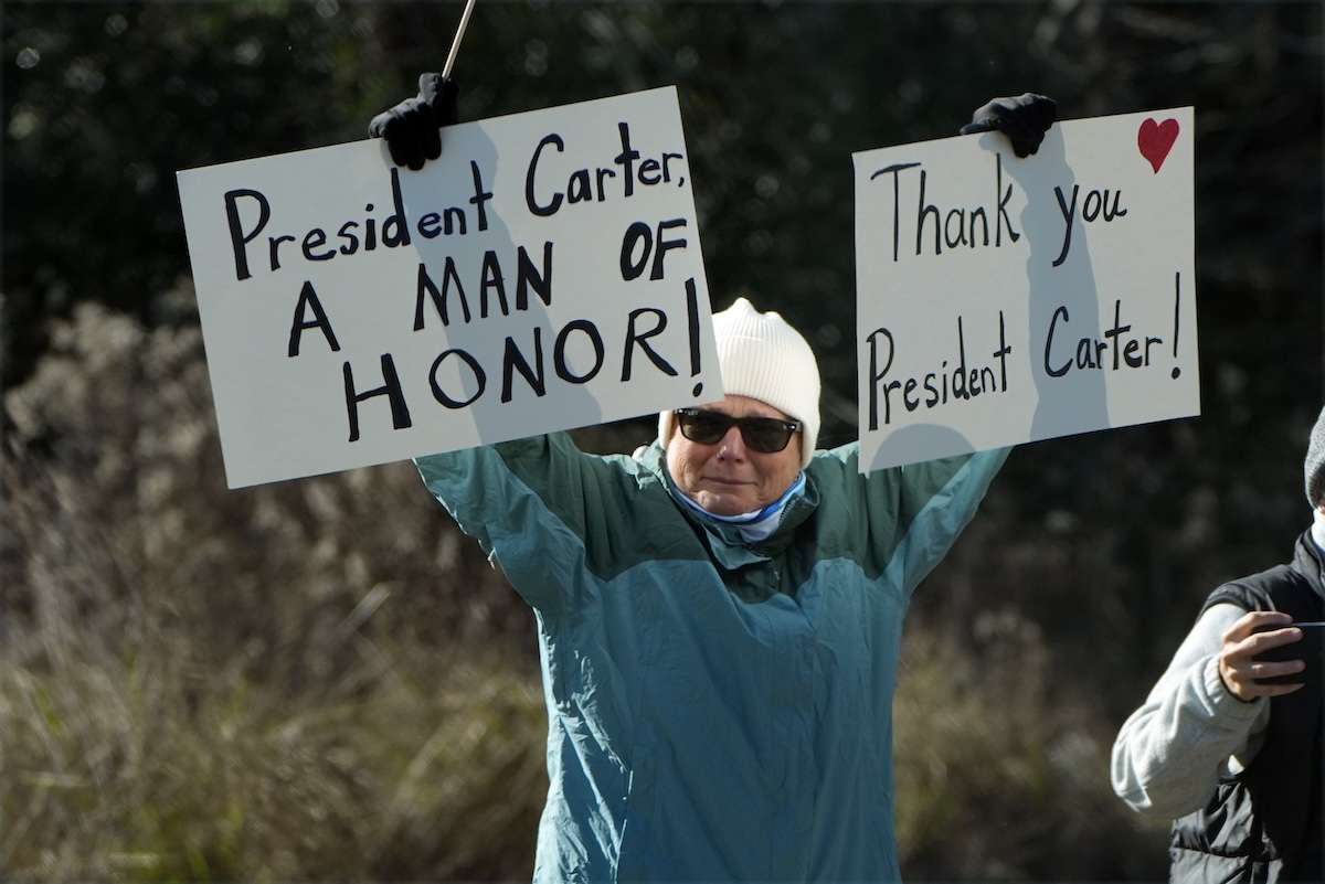 The Carters lived nearly all their lives in Plains, with the exception of his Naval service, four years in the Governor’s Mansion and four years in the White House. As his hearse rolled through the town, mourners lined the main street, some holding bouquets of flowers and wearing pins bearing images of the former president and his signature smile.