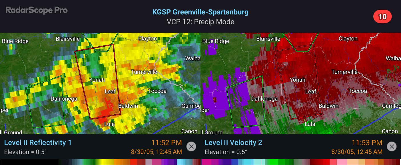 Here across North Georgia there were 14 official tornadoes in the Peachtree City forecast area, with 6 of those occurring across Northeast Georgia. Arguably the worst of these tornadoes came from a cell that produced two tornadoes across Hall and White Counties. Using Radarscope you are able to go back and see the tornado warning as well as the rain and winds associated with the cell. Tight rotation was observed from roughly Lula all the way through just north of Helen.