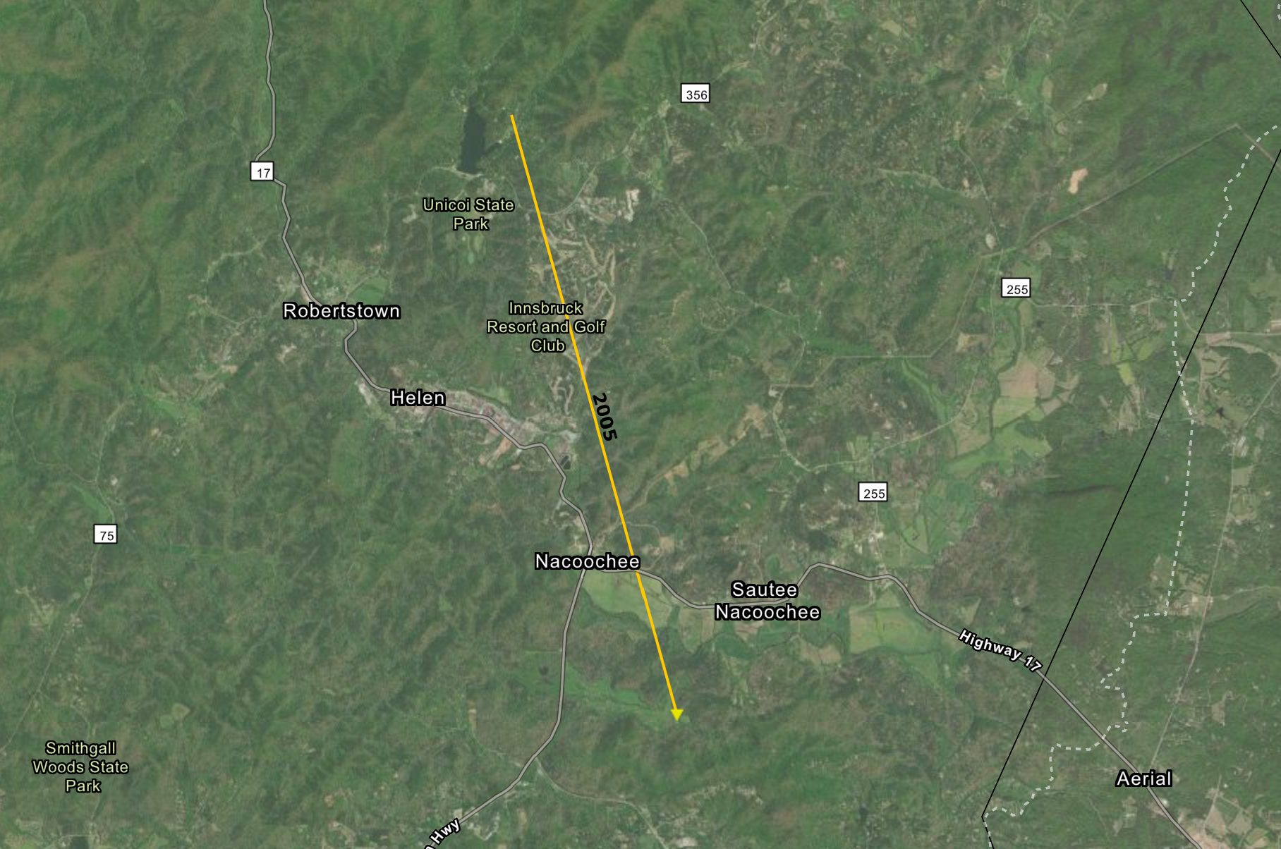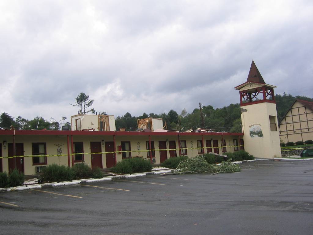 A tornado warning was issued at 12:11AM EDT for most of White County, including Helen. The same storm cycled and then produced an additional, much stronger tornado. The tornado touched down nearby the historic Hardman Farm and tracked roughly 5 miles into Helen before it lifted upon running into the higher elevations on the eastern side of town. The maximum width of the tornado was an impressive 300 yards. The storm caused significant damage to the Econolodge motel and a nearby clothing store. It is worth noting from the image below that the only thing left standing on the second floor of the motel are the bathrooms: a very important lesson in tornado safety.