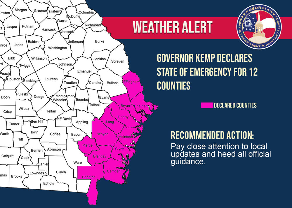 Florida is now under a State of Emergency and Georgia Governor Brian Kemp Thursday declared a State of Emergency for twelve coastal Georgia counties including Brantley, Bryan, Camden, Charlton, Chatham, Effingham, Glynn, Liberty, Long, McIntosh, Pierce, and Wayne. The governor has also suspended restrictions on commercial vehicles to assist in storm preparation, response, and recovery.