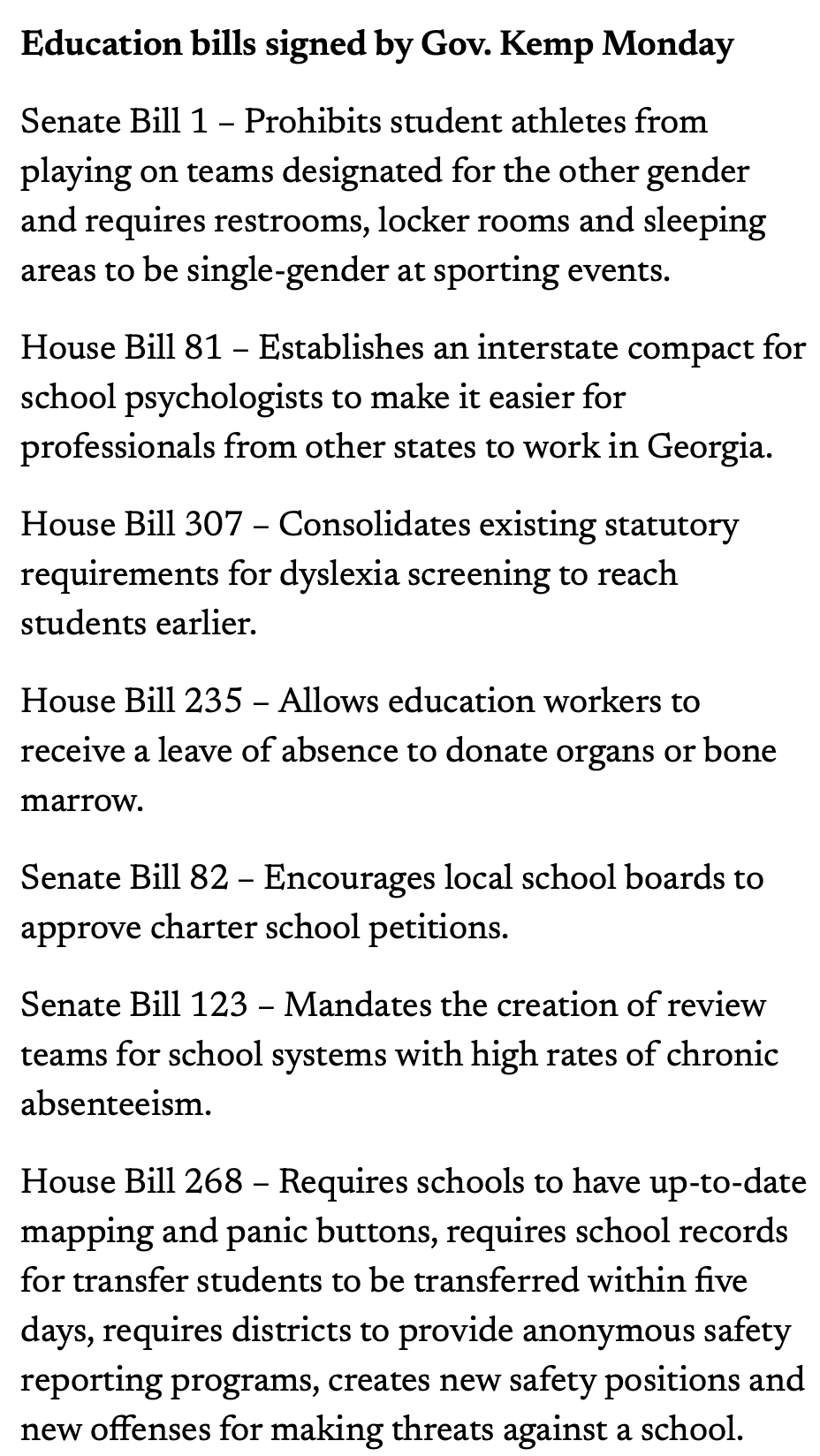 “As the parents of three daughters, (First lady Marty Kemp) and I know just how important it is to keep our children safe and to give them the best possible start in life,” Kemp said. “That’s why I’m proud to sign these bills that will further safeguard our classrooms, both from those with violent intentions and from out-of-touch political agendas.”