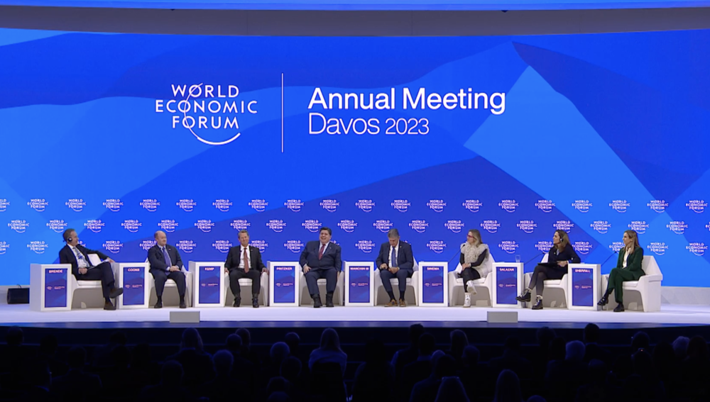 Børge Brende, president of the World Economic Forum, led the conversation with Kemp and panelists U.S. Sens. Kyrsten Sinema (AZ-I), Chris Coons, (DE-D), Joe Manchin (WV- D); U.S. Reps. Maria Elvira Salazar (FL-R) and Mikie Sherrill (NJ-D); and J.B. Pritzker, governor of Illinois.
