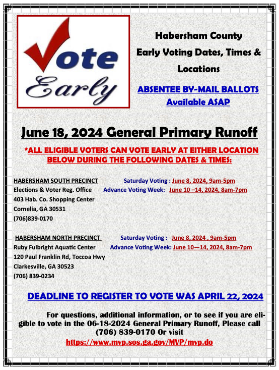 The county elections office says absentee by-mail ballots will be available “as soon as possible.” The absentee application deadline is June 7. To request an absentee ballot, download the application form from the My Voter Page (MVP) on the Georgia Secretary of State’s website or contact the Habersham County Elections Office at (706) 839-0170.