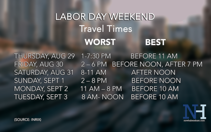 The 78-hour holiday travel period begins Friday, August 30, at 6 p.m., and ends Monday, September 2, at 11:59 p.m.